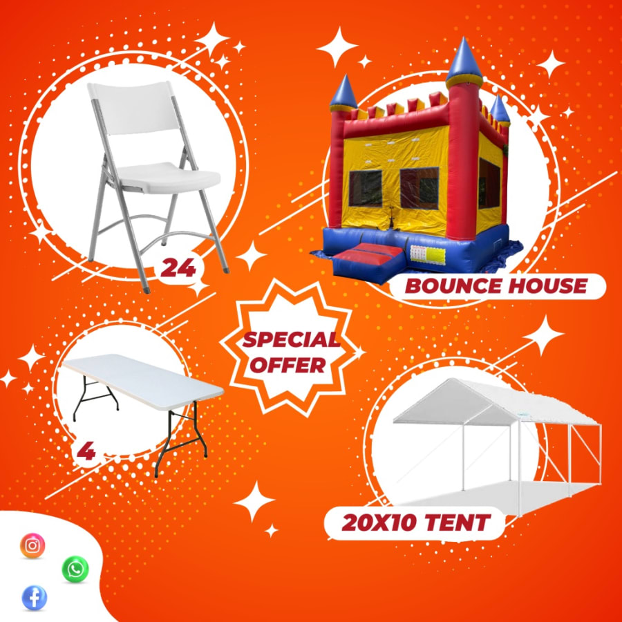 24chairs/4 tables/20x10 tent with led light/Bounce house.